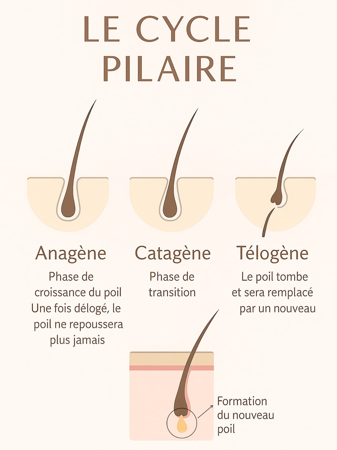 Le cycle pilaire est le processus biologique qui régit la croissance, la régression et la chute des cheveux. Chaque follicule pileux fonctionne de manière indépendante et suit un cycle en 3 grandes phases (parfois 4 selon les classifications).